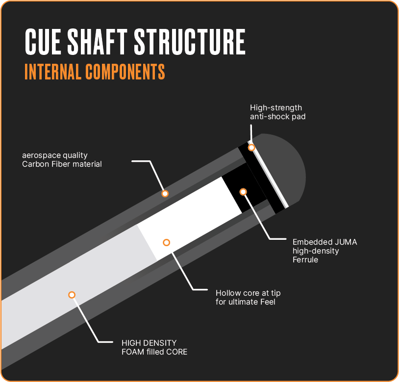 Meet the newly engineered carbon fiber performance shaft. Our cue is constructed with aerospace carbon fiber and an acoustic-dampening core filling for advanced cue control.